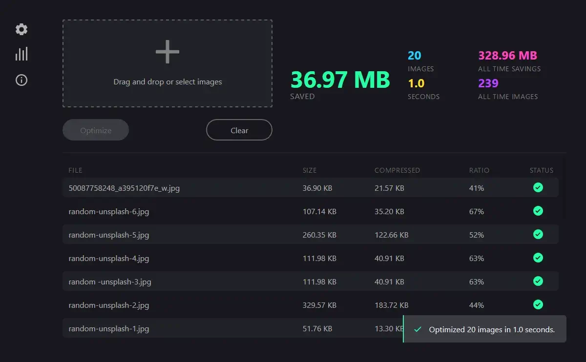 CommunityShowcase옵티머스(Optimus)버전: v2.6.0옵티머스(Optimus)Optimus 데스크탑 이미지 최적화 애플리케이션입니다. WebP, JPEG, PNG 이미지 포맷 형식간의 변환 및 압축을 지원합니다.