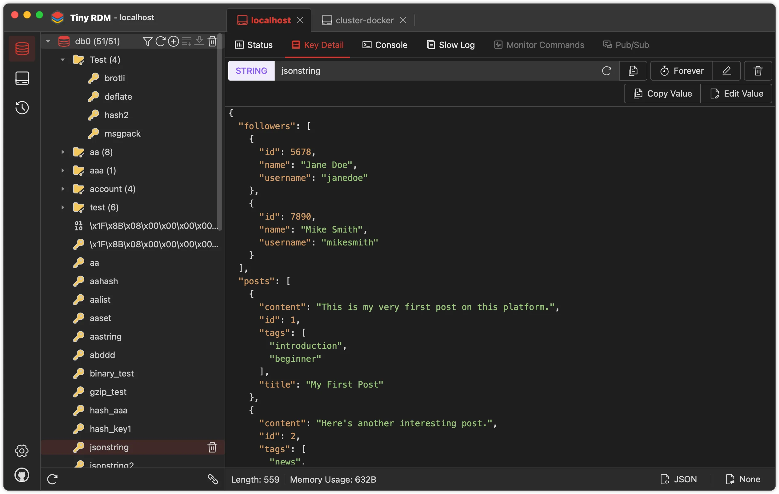 The Tiny RDM application is an open-source, modern lightweight Redis GUI. It has a beautful UI, intuitive Redis database management, and compatible with Windows, Mac, and Linux. It provides visual key-value data operations, supports various data decoding and viewing options, built-in console for executing commands, slow log queries and more.